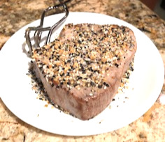 When all sides of Tuna are seared, dredge in Everything but the Bagel Seasoning (I got mine at Trader Joe's.)